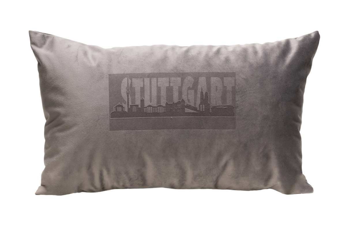 Elegantes Kissen Laserung in Samtoptik – Stuttgart mit Skyline