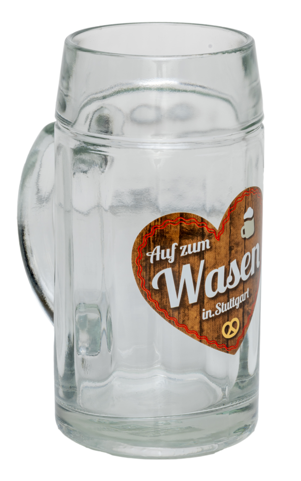 Glaskrug mit Aufdruck des Cannstatter Volksfest-Herzes